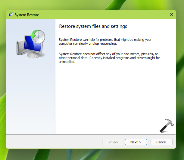 Anteriormente, vimoscomo criar um ponto de restauração do sistema no Windows 11. Agora neste guia, veremos como restaurar o Windows 11 para uma data anterior. Restaurar o seu sistema para uma data anterior iránãoafetam arquivos pessoais em sua pasta de usuário (esta pasta pode ser acessada quando você executa%UserProfile%comando). No entanto, o processo de Restauração do Sistema removerá software ou aplicativos, atualizações e drivers instalados logo após a criação do ponto de restauração para o qual deseja voltar.