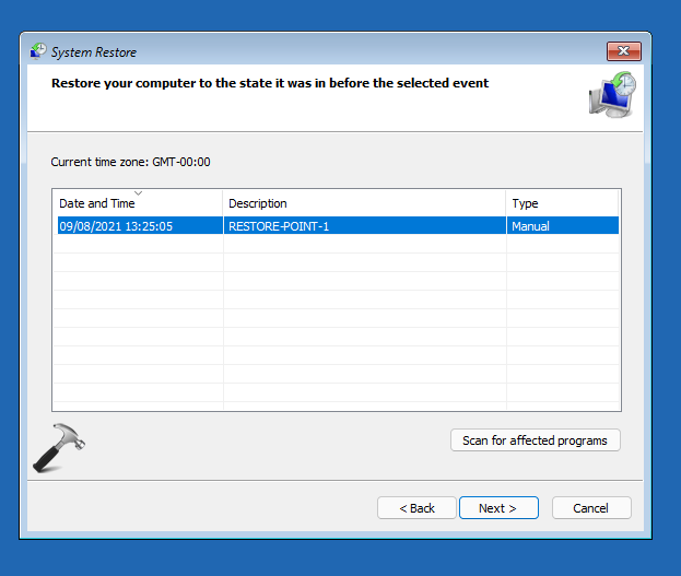 4.Selecione o ponto de restauração que deseja restaurar. Você pode clicar aqui emProcure programas afetadospara ver quais aplicativos ou programas serão afetados quando você restaurar para o ponto selecionado.