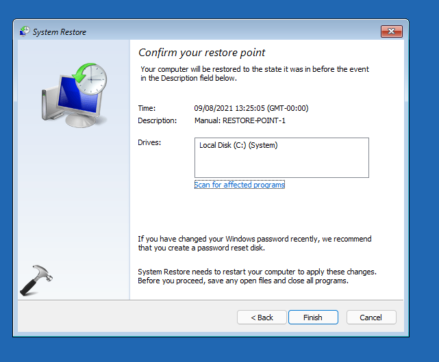 5.Depois de revisar os programas afetados, clique emFecharpara voltar à janela anterior. Usando o botão Verificar programas afetados, você poderá escolher o melhor ponto de restauração que seja benéfico para você.