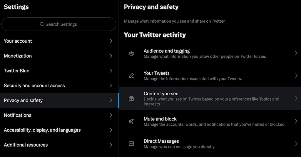 - SelecionePrivacidade e segurança, então sobSua atividade no Twitter,selecioneConteúdo que você vê.