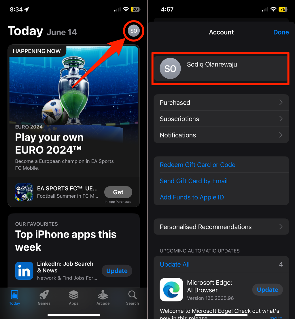 - Toque no seuícone de perfilno canto superior direito e selecione seu nome ou ID Apple.