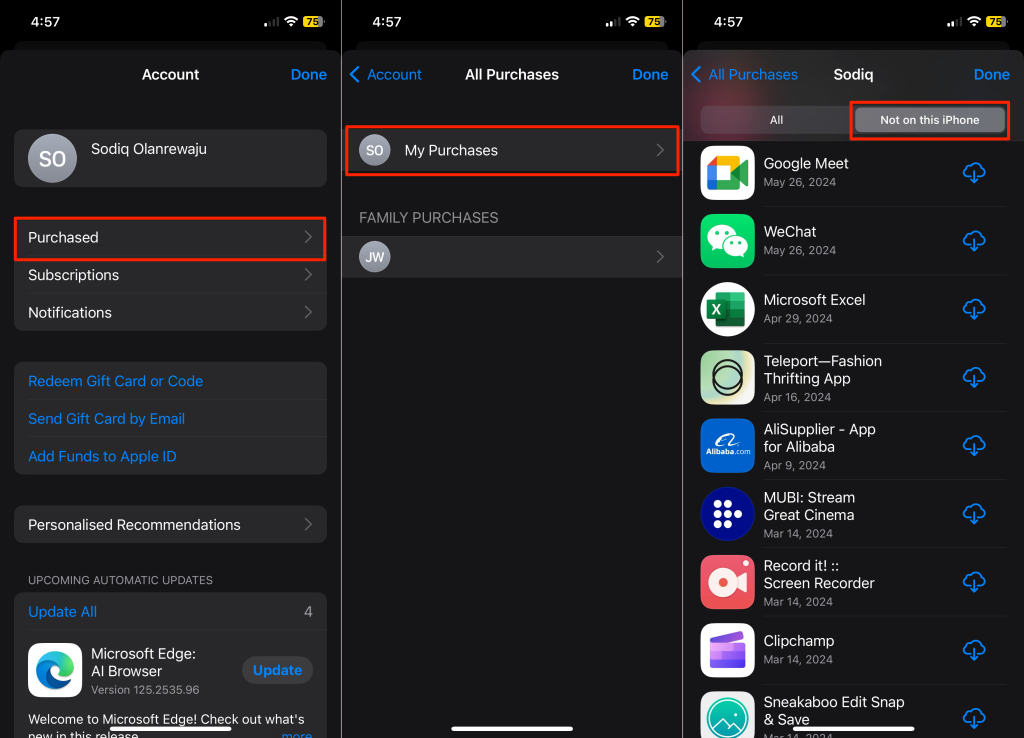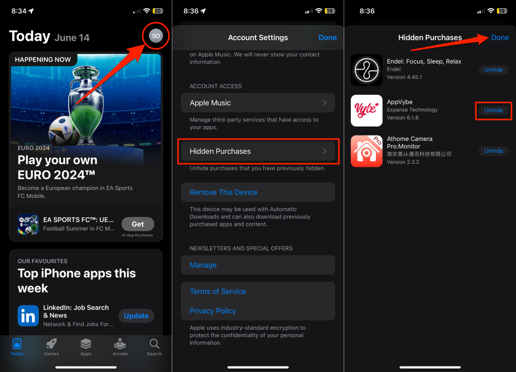 A App Store possui um recurso “Compras Ocultas” que permite aos usuários ocultar compras de aplicativos. Portanto, visualizar seus downloads/compras ocultos de um aplicativo excluído também é uma boa ideia. Se você não encontrar um aplicativo excluído em seu histórico de compras, retorne à tela inicial da App Store e prossiga para a etapa 4.