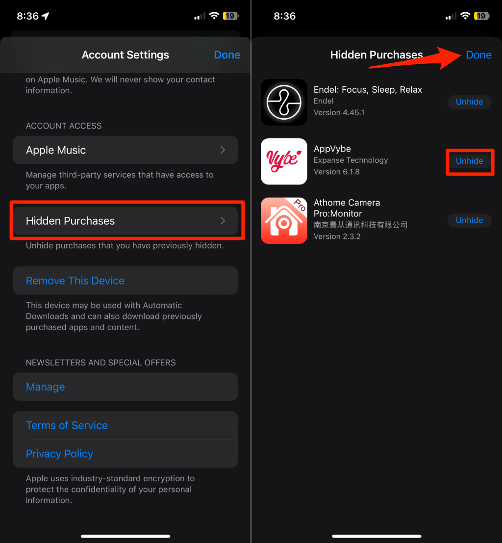 - TocarMostrarao lado do aplicativo oculto. Reexibir um aplicativo o retorna à sua lista de compras de aplicativos. TocarFeitopara fechar a tela.