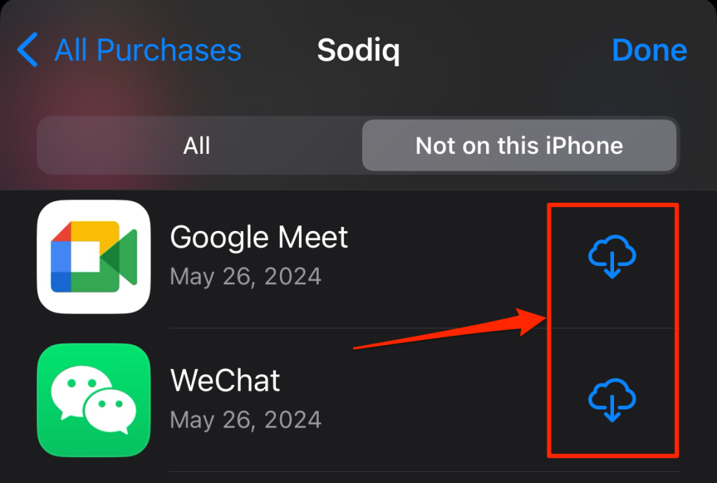 Toque noDownloadícone (um ícone de nuvem com uma seta apontando para baixo) próximo ao aplicativo que você deseja recuperar.