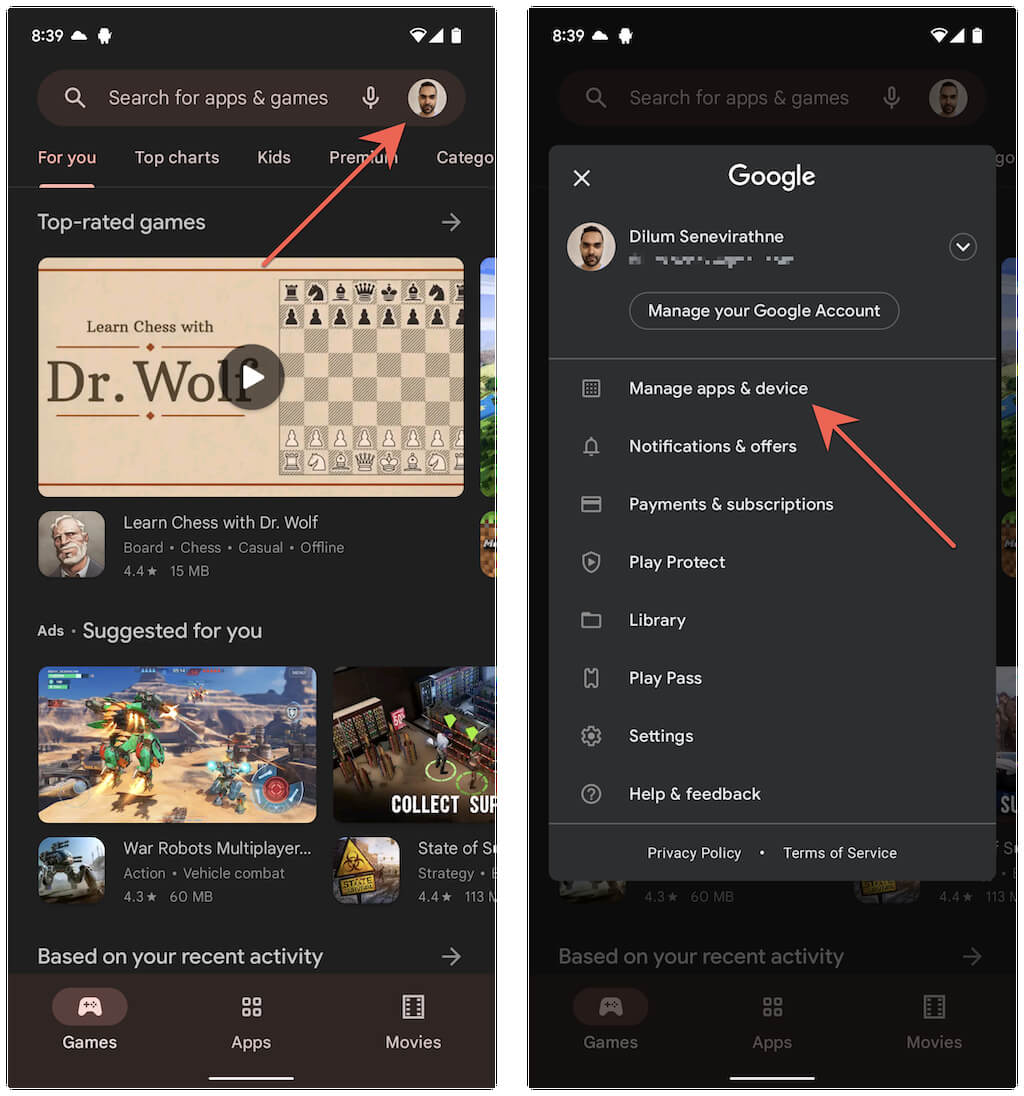 - Abra oGoogle Play Storeaplicativo, selecione seufoto do perfil/íconeno canto superior direito e toque emGerenciar aplicativos e dispositivos.