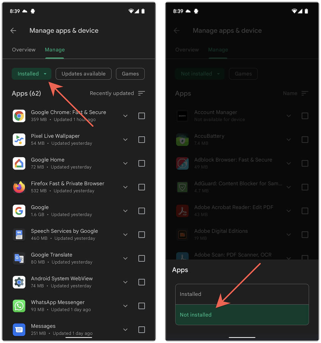 - Mude para oGerenciarguia. Isso exibe todos os aplicativos instalados no seu dispositivo. Para ver aplicativos excluídos, toque noInstaladoopção suspensa e escolhaNão instalado.