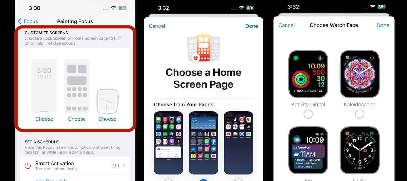 Agora, os usuários podem personalizar o Focus fornecido ou criar um novo com Filtros de Foco para alterar a forma como os aplicativos funcionam, como silenciar temporariamente todas as notificações ou permitir apenas notificações específicas, vincular o Focus a uma tela de bloqueio para ativá-lo rapidamente e personalizar a tela inicial para mostrar apenas aplicativos relacionados ao Focus definido.