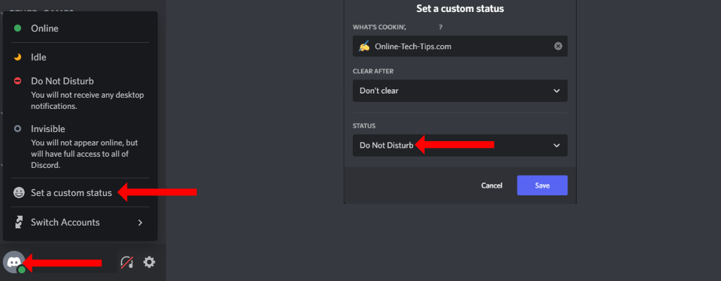Por padrão, seu status do Discord será “Online” (quando você estiver ativo) ou “Inativo” (quando você estiver ausente do aplicativo por um tempo). Você pode selecionarNão incomodaraqui para silenciar todas as notificações da área de trabalho no Discord. O Discord silenciará essas notificações até que você altere seu status manualmente.