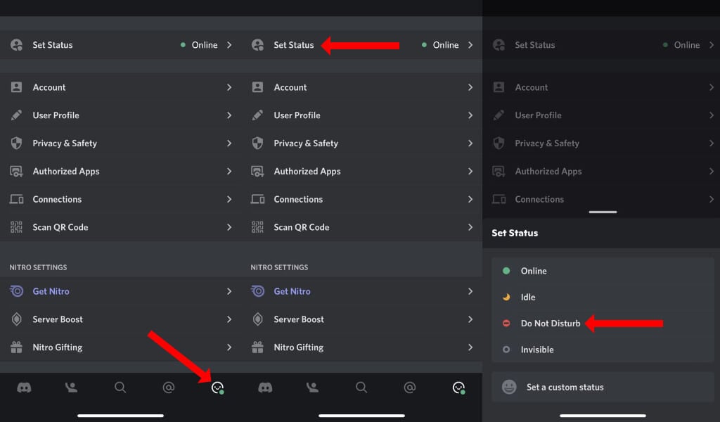 Agora toque no ícone do perfil no canto inferior direito e toque emDefinir status. SelecioneNão incomodarpara ativar o DND no Discord mobile.