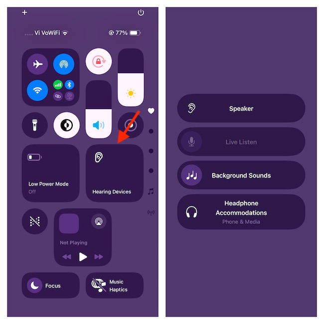 Invoque o Centro de Controle no seu iPhone (deslizando de cima para baixo na tela) e toque no ícone “Audição”. Então, você terá acesso a todos os seus recursos auditivos favoritos, incluindo –