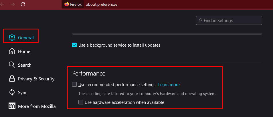 - DesmarqueUse o desempenho recomendado,e isso também desmarcará oUse aceleração de hardware quando disponívelopção.