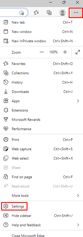 - Abra o Microsoft Edge e clique no ícone de três pontos. SelecioneConfiguraçõesno menu suspenso.