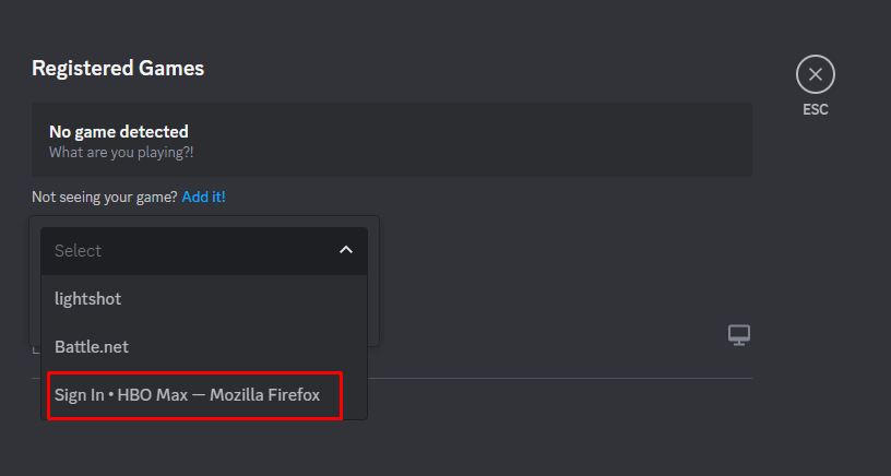 - Selecione o navegador aberto onde o HBO Max está no menu suspenso e clique no botãoAdicionar jogobotão.