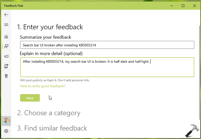 4.Agora preencha os detalhes do seu feedback, como título, explicação, etc. Certifique-se de não enviar nenhuma informação pessoal aqui, pois o feedback ficará visível ao público.