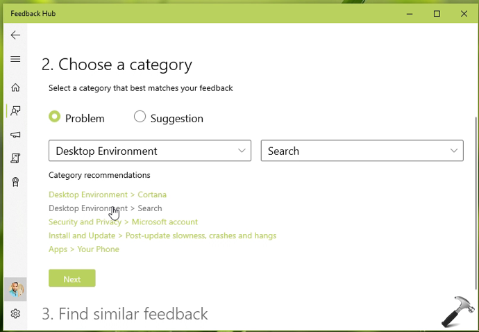 5.Em seguida, em Escolha uma categoria, selecione se o seu feedback representa um problema ou uma sugestão. Em seguida, escolha a categoria apropriada que melhor corresponda.