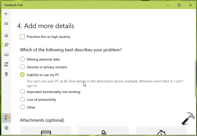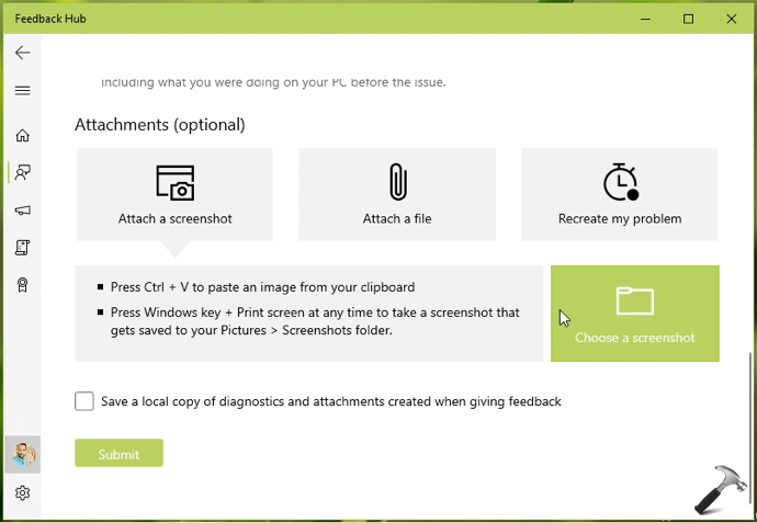 7.Opcionalmente, você pode adicionar uma captura de tela/arquivo ou gravação de tela como prova de que está enfrentando esse problema. Se quiser salvar uma cópia local do seu feedback, você pode verificarSalve uma cópia local dos diagnósticos e anexos criados ao fornecer feedbackopção.