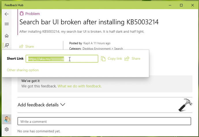 10.Finalmente, você pode ir para minha seção de comentários e clicar no feedback que acabou de enviar. Você pode clicar emCompartilharbotão ali para gerar um link curto para seu feedback. Você pode compartilhar esse link com outras pessoas em fóruns, para que elas possam votar positivamente neste feedback se concordarem com você.