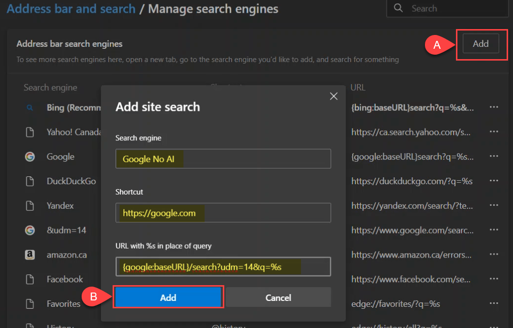 - NoAdicionar pesquisa de sitesjanela, crie umaNomecomoGoogle No AI.