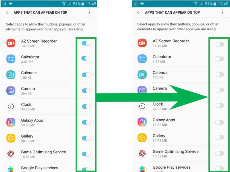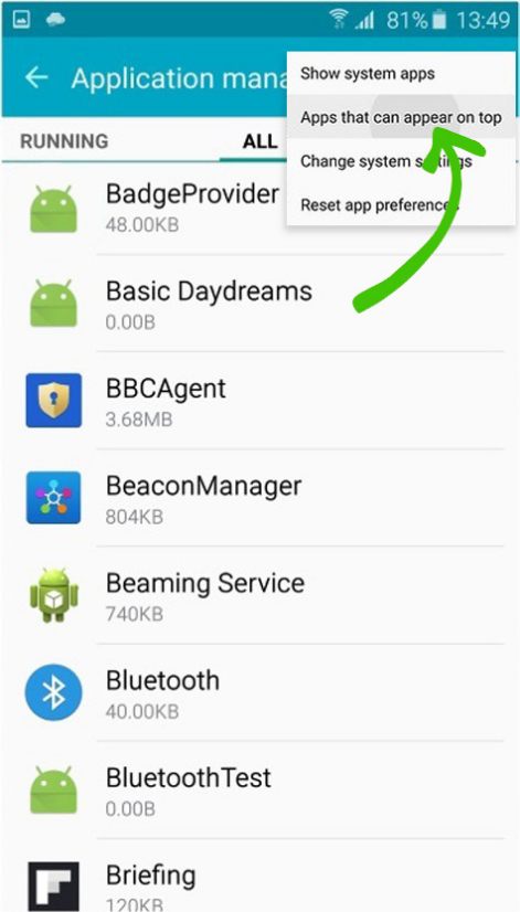 - Manualmentedesative a permissão de sobreposição de tela para todos os aplicativos.