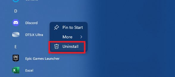 2.Clique com o botão direito emDiscórdiae escolha oDesinstalaropção.