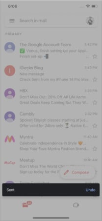 Depois de clicar no botão enviar e-mail, você verá um pop-up na parte inferior da tela para “desfazer a mensagem”. toque nele para recuperar sua mensagem. O processo é mais ou menos o mesmo em todos os clientes de e-mail, tanto no aplicativo web quanto nas versões móveis.