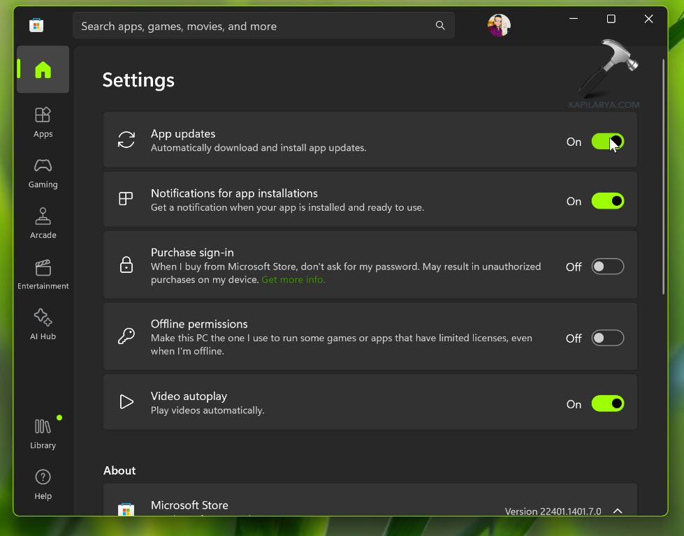 Em Configurações, a primeira opção éAtualizações de aplicativos. Basta ligá-lo e, ao ligá-lo, o Windows baixará e instalará automaticamente atualizações de aplicativos em seu sistema.