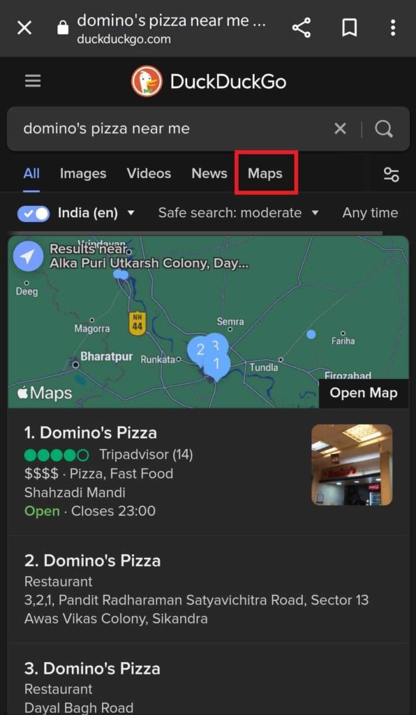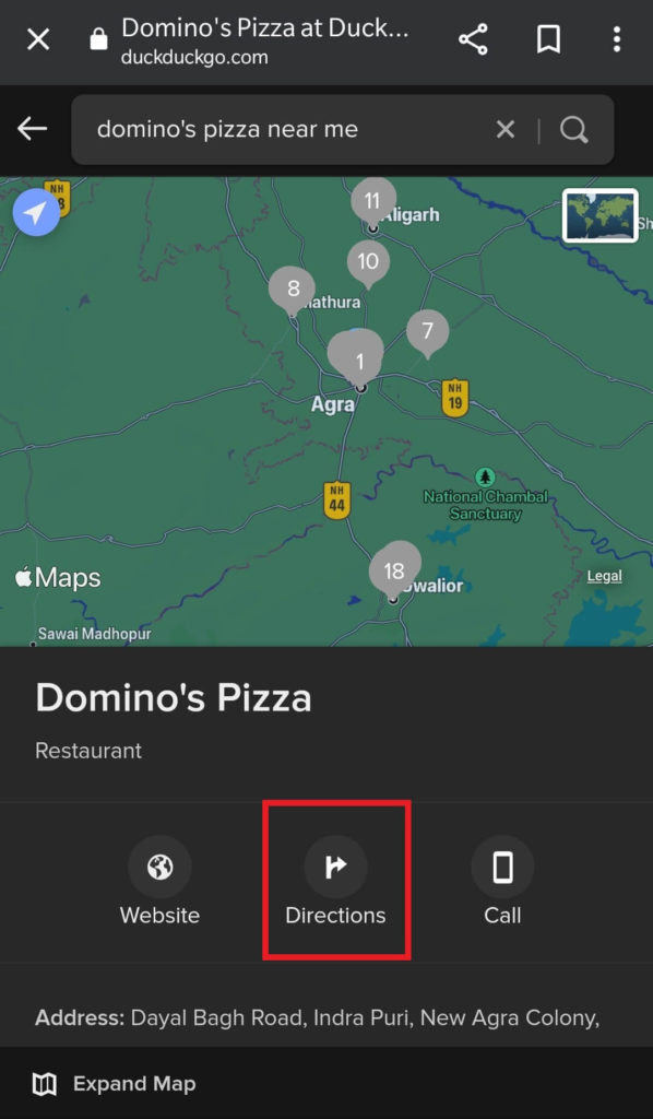 Cada navegador exibe rotas, bem como outras pesquisas baseadas em localização usando seu mecanismo de mapeamento integrado. Para acessar mapas da Apple no Android e Windows, usePatoDuckGo,o melhor mecanismo de pesquisa com foco na privacidade.Para preservar seu status de privacidade, DuckDuckGo usa Apple Maps como mecanismo de mapeamento nativo.