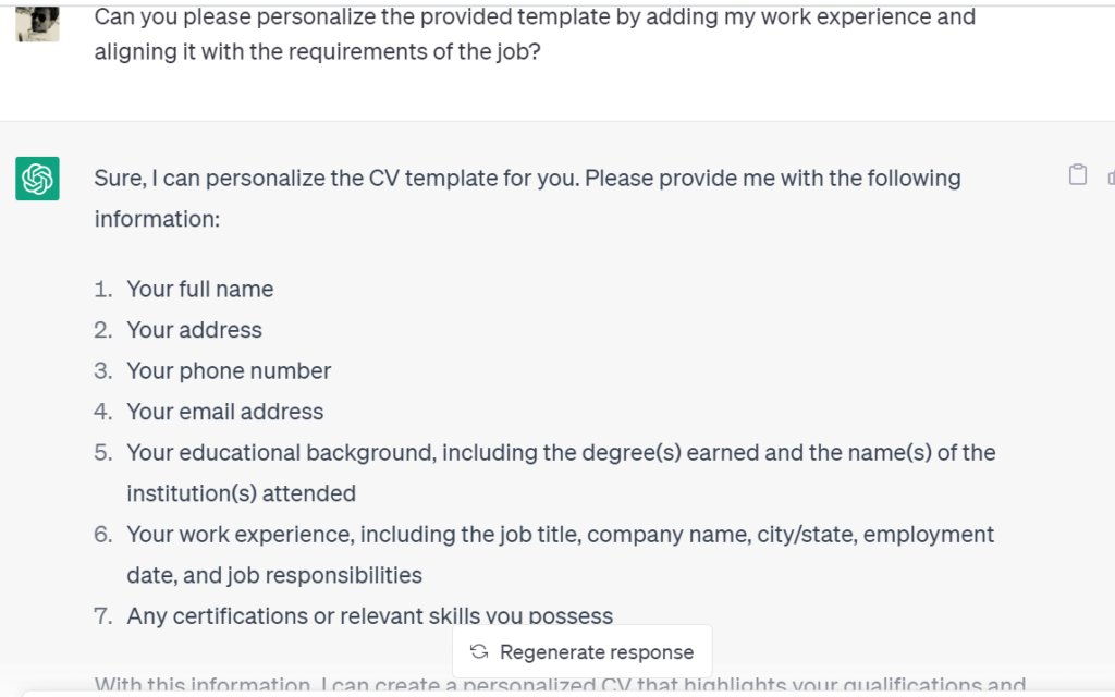 - Pergunte ao ChatGPT,“Você poderia me ajudar a elaborar um currículo personalizado que se alinhe aos requisitos de um anúncio de emprego específico?”