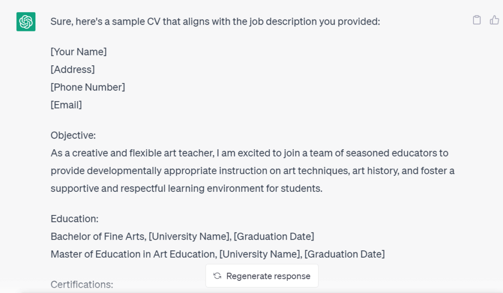 No entanto, se você não souber por onde começar, não se preocupe – o ChatGPT pode ajudar. Ao analisar uma vaga específica, o ChatGPT pode gerar um modelo personalizado para você usar como ponto de partida, mesmo que ainda não tenha um currículo completo. Dessa forma, você pode ter certeza de que sua inscrição está otimizada para o emprego ao qual está se candidatando.