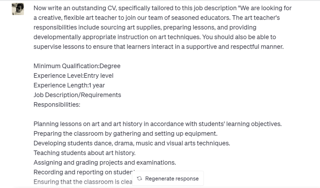 - Agora, copie e cole toda a descrição do trabalho e digite o seguinte prompt do ChatGPT para retomar a criação“Agora escreva um currículo excelente, adaptado especificamente para esta descrição de cargo ”