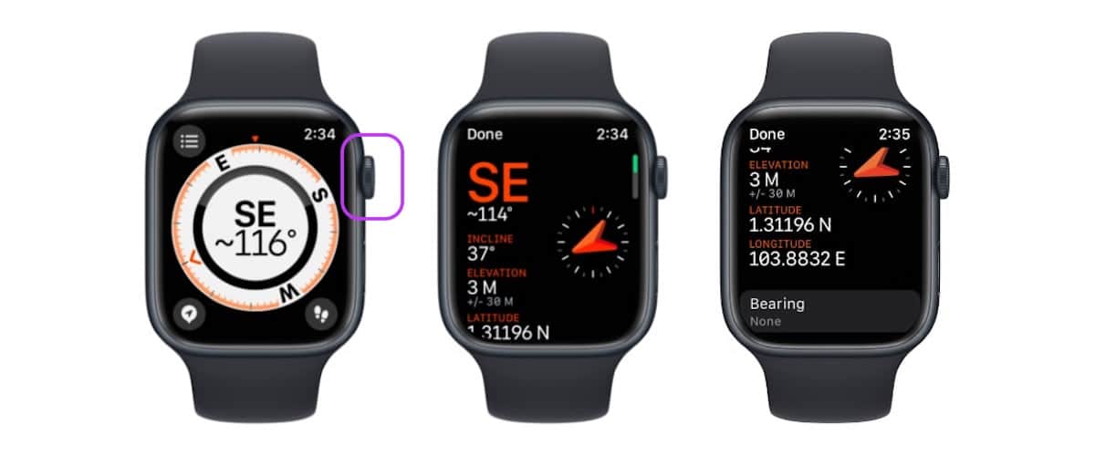 Nos modelos Apple Watch rodando no watchOS 9, basta abrir o aplicativo Bússola para ver sua direção e rumo. Basta girar a coroa digital para cima para ver sua elevação, inclinação e coordenadas.