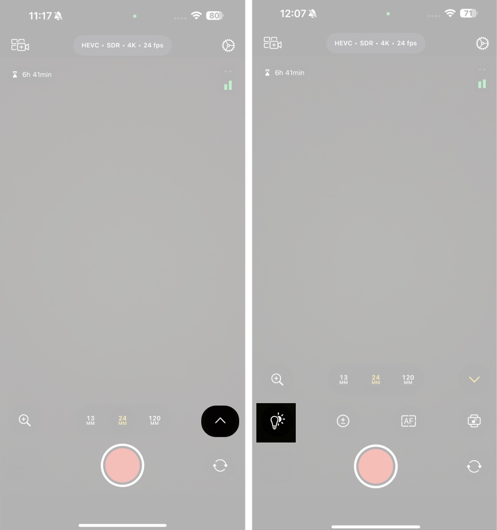Agora, a parte principal: configurações manuais da câmera Final Cut. Para acessar o menu de configurações manuais, deslize para cima na tela ou toque na seta para cima no canto inferior direito.