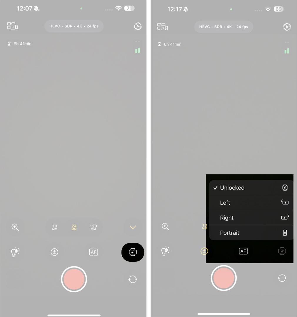 Por último, o botão de orientação permite definir a orientação da câmera para paisagem (esquerda ou direita) e retrato.