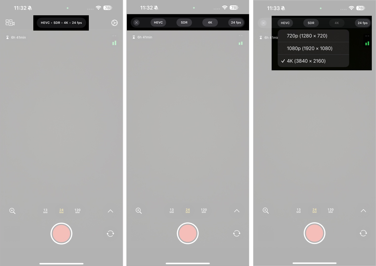 Toque na pílula na parte superior central para alterar as configurações de gravação de vídeo. Aqui você pode ajustar configurações individuais, comocodec,vídeo formatar,resolução, equadros, com base na sua preferência.