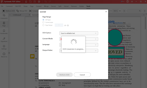1. Execute OCRPara editar PDF digitalizado –O Systweak PDF Editor elimina as limitações de PDFs estáticos e não editáveis, pois este software aproveita o OCR para converter documentos digitalizados em arquivos pesquisáveis. Para utilizar o recurso, basta abrir o arquivo PDF digitalizado e o software mostrará a opção Executar OCR. Clique no mesmo e pronto!