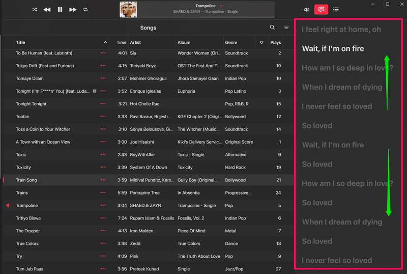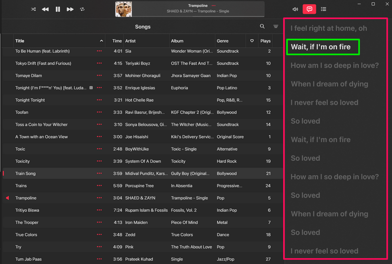 9.Agora, se você deseja fechar o painel Live Lyrics de músicas no aplicativo Apple Music no Windows 11, basta clicar no botãoBotão Letrascom o qual você o abriu.