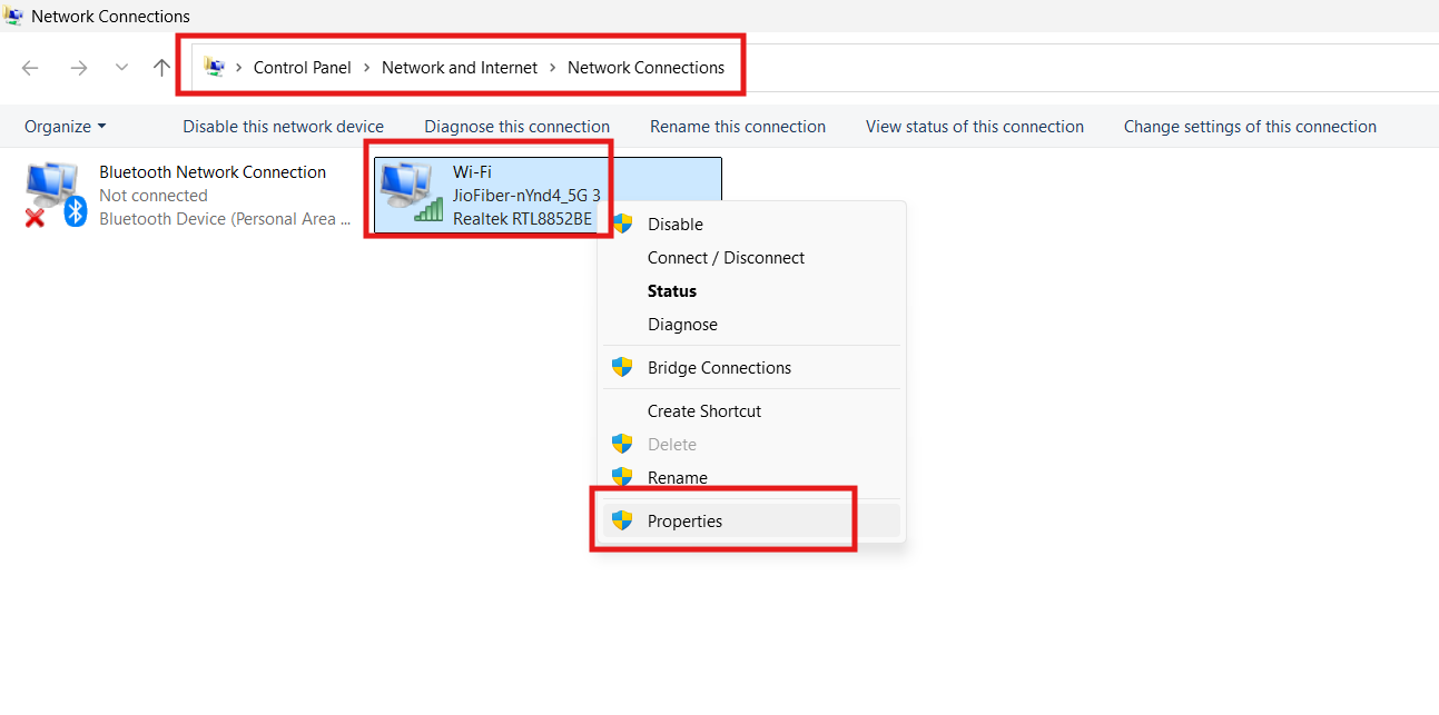 2. Clique com o botão direito no adaptador de rede ativo (Wi-Fi ou Ethernet) e selecione Propriedades.