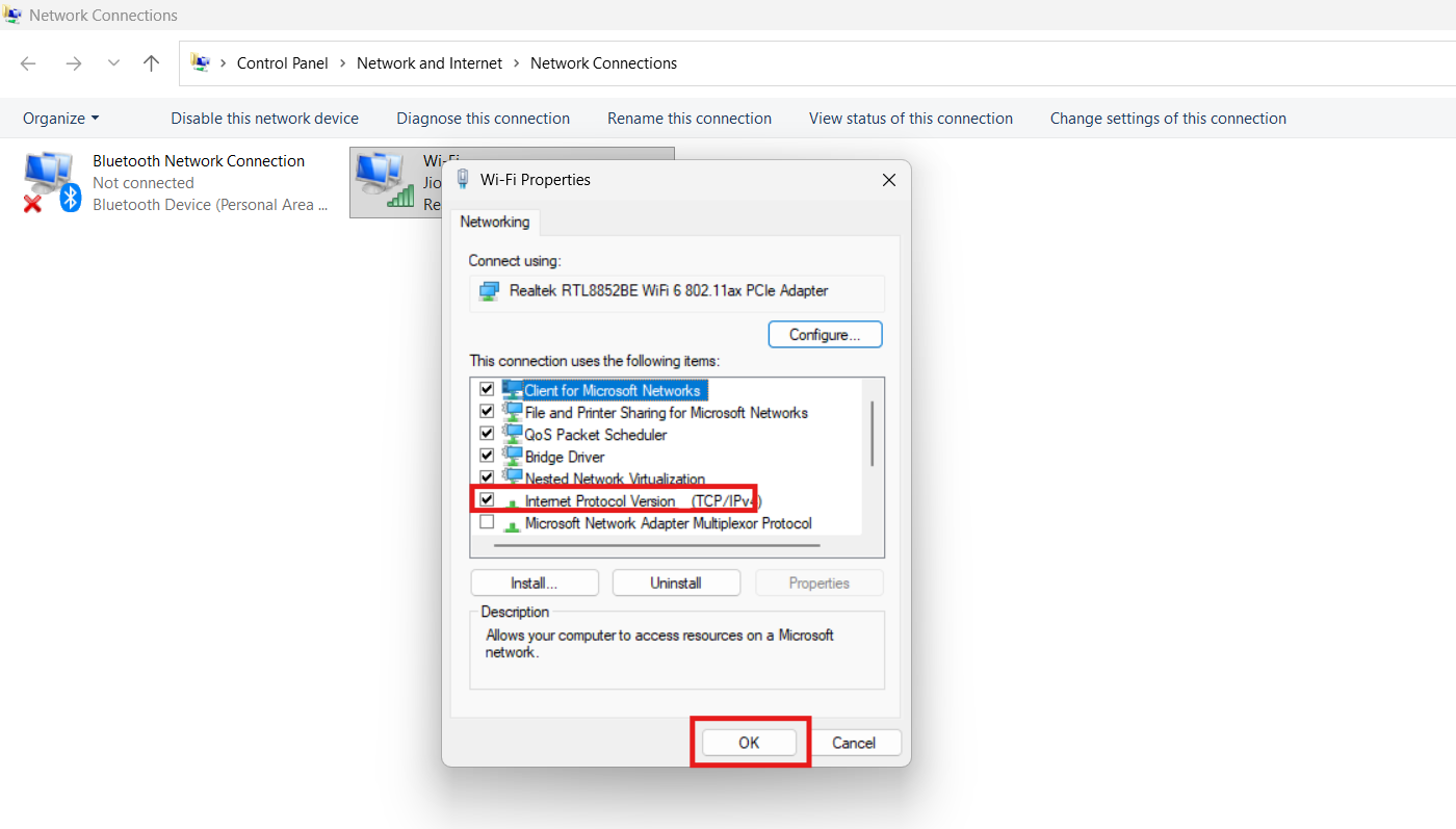 4. Aguarde 10 segundos, abra Propriedades novamente, verifique novamente o Protocolo da Internet Versão 6 (TCP/IPv6) e selecione OK.