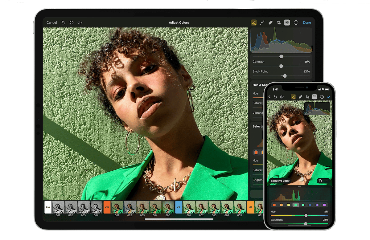 Pixelmator Photo traz a experiência de edição de fotos em desktop para iPhone e iPad com suporte nativo para edição RAW e ferramentas poderosas para ajuste de cores como Curvas, Níveis, Matiz e Saturação, Preto e Branco, Cor Seletiva e muito mais. Integrado ao iOS, o Pixelmator Photo sincroniza automaticamente as alterações dos usuários com o aplicativo Fotos.