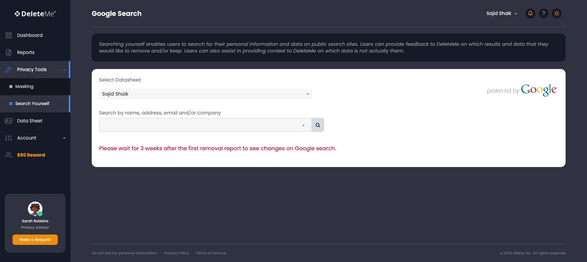 Além de remover seus dados, DeleteMe oferece mais duas ferramentas de privacidade ao escrever esta análise: Mascaramento e Pesquisar você mesmo.