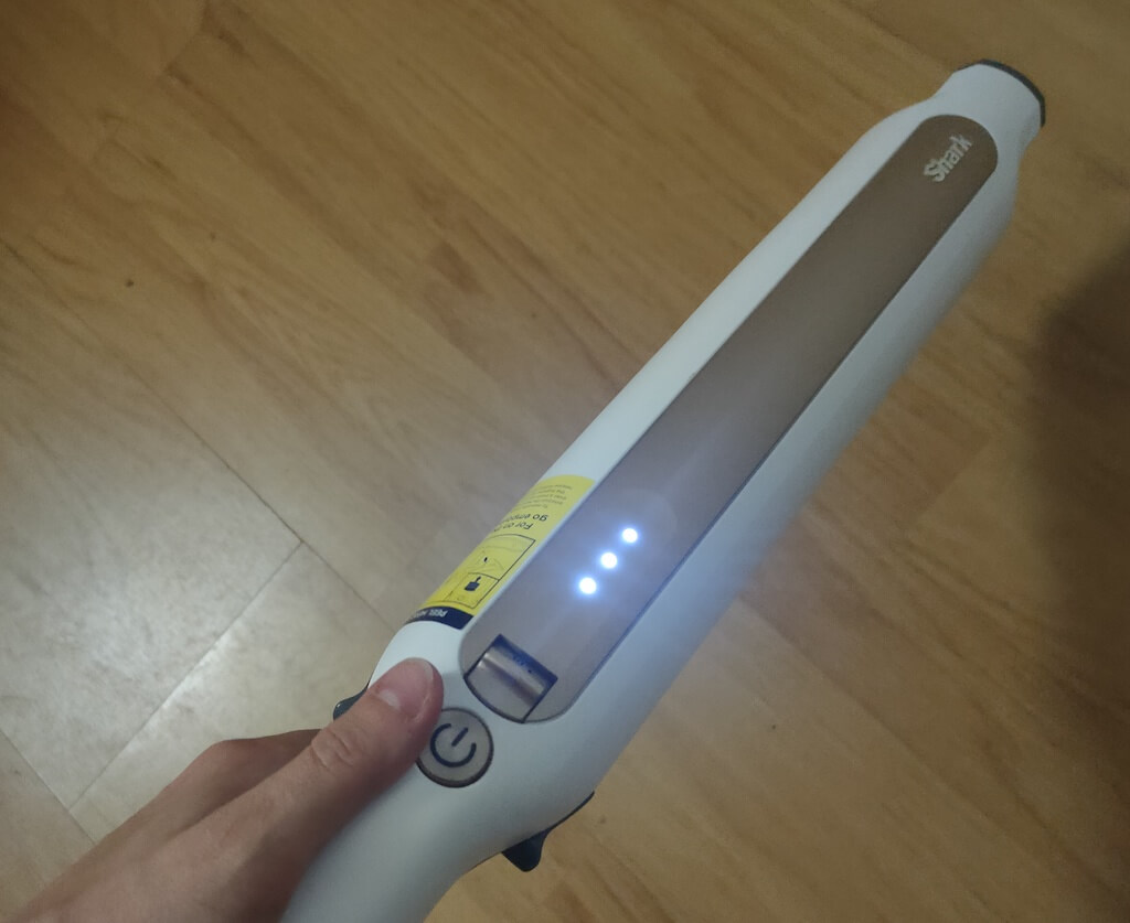 Na alça do aspirador, logo abaixo do botão liga / desliga, você encontrará três luzes LED brilhantes. Essas luzes indicam quanta bateria resta no aspirador. Três luzes acendem quando o aspirador está totalmente carregado, duas luzes para carga intermediária e uma luz para cerca de 30% de carga restante. Quando a luz começar a piscar, você saberá que é hora de pausar a limpeza e carregar o aspirador portátil Shark Wandvac.