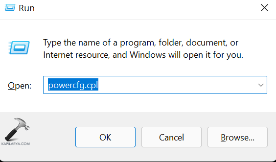 Passo 1-Primeiro, pressione Windows + R e abra a caixa de diálogo Executar. Em seguida, escreva o comando abaixo e pressione Enter para abrir as opções de energia.
