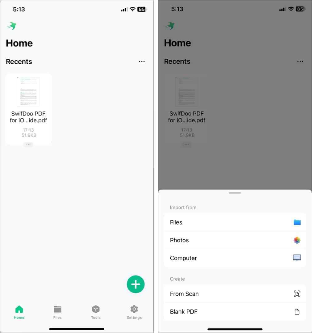 Tocar no sinal de mais no canto inferior esquerdo permitirá criar um PDF em branco ou importar um de Arquivos, Fotos ou Computador. Você também pode digitalizar diretamente o seu documento para criar um PDF. Além disso, você pode acessar todas as ferramentas oferecidas pelo SwifDoo na seção Ferramentas.