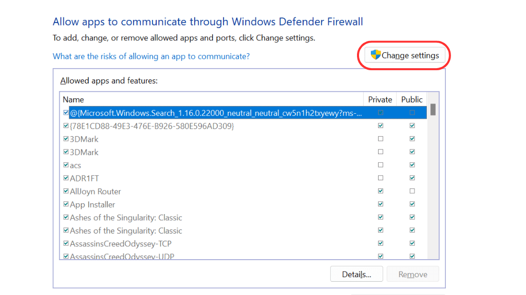 - Procure Steam na lista de aplicativos e recursos permitidos. Se não estiver lá, cliqueAlterar configurações,