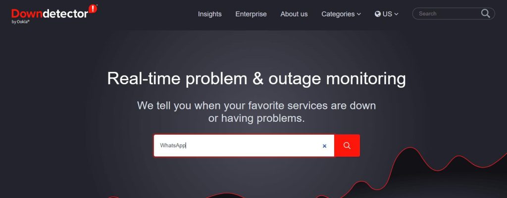 Abra o site do downdetector edigite WhatsAppna barra de pesquisa e clique no ícone de pesquisa. Ele informará o status atual do WhatsApp.