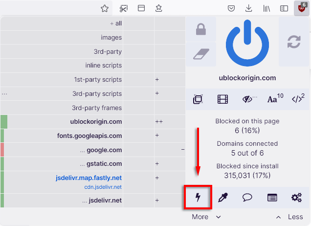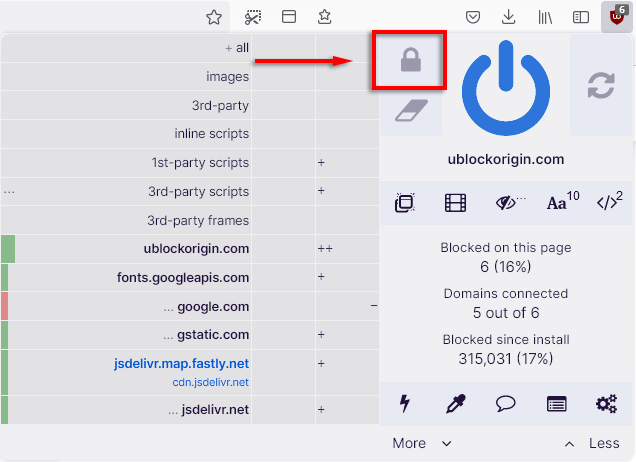 A filtragem dinâmica permite que os usuários adicionem regras que substituem a filtragem estática, proporcionando controle adicional sobre o tipo de conteúdo que você pode bloquear ou permitir. Isso pode ser alternado clicando noícone do uBOe selecionando oMenoseMaisbotões.