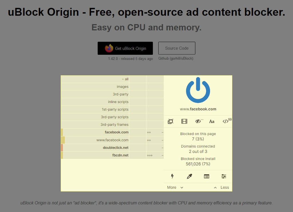 O objetivo principal do uBlock Origin é fornecer às pessoas proteção contra a invasão cada vez maior de privacidade online. É um bloqueador de anúncios gratuito e de código aberto e um complemento de filtragem de conteúdo para vários navegadores da web.