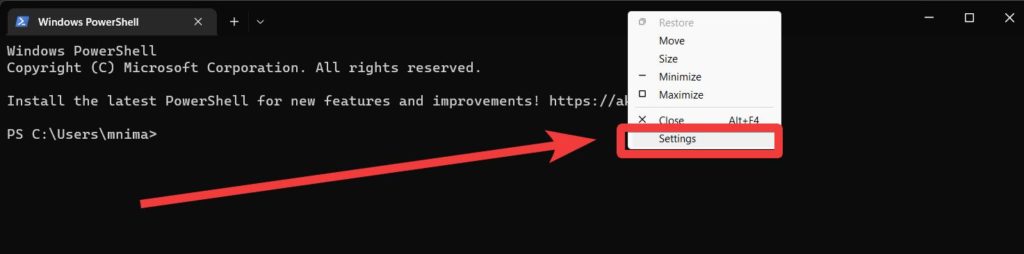 Passo 1: Abra o Windows Powershell e clique com o botão direito na guia para abrir Configurações.