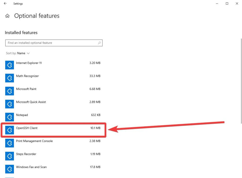 Agora, de fato, o cliente OpenSSH pode ser encontrado nos recursos instalados.