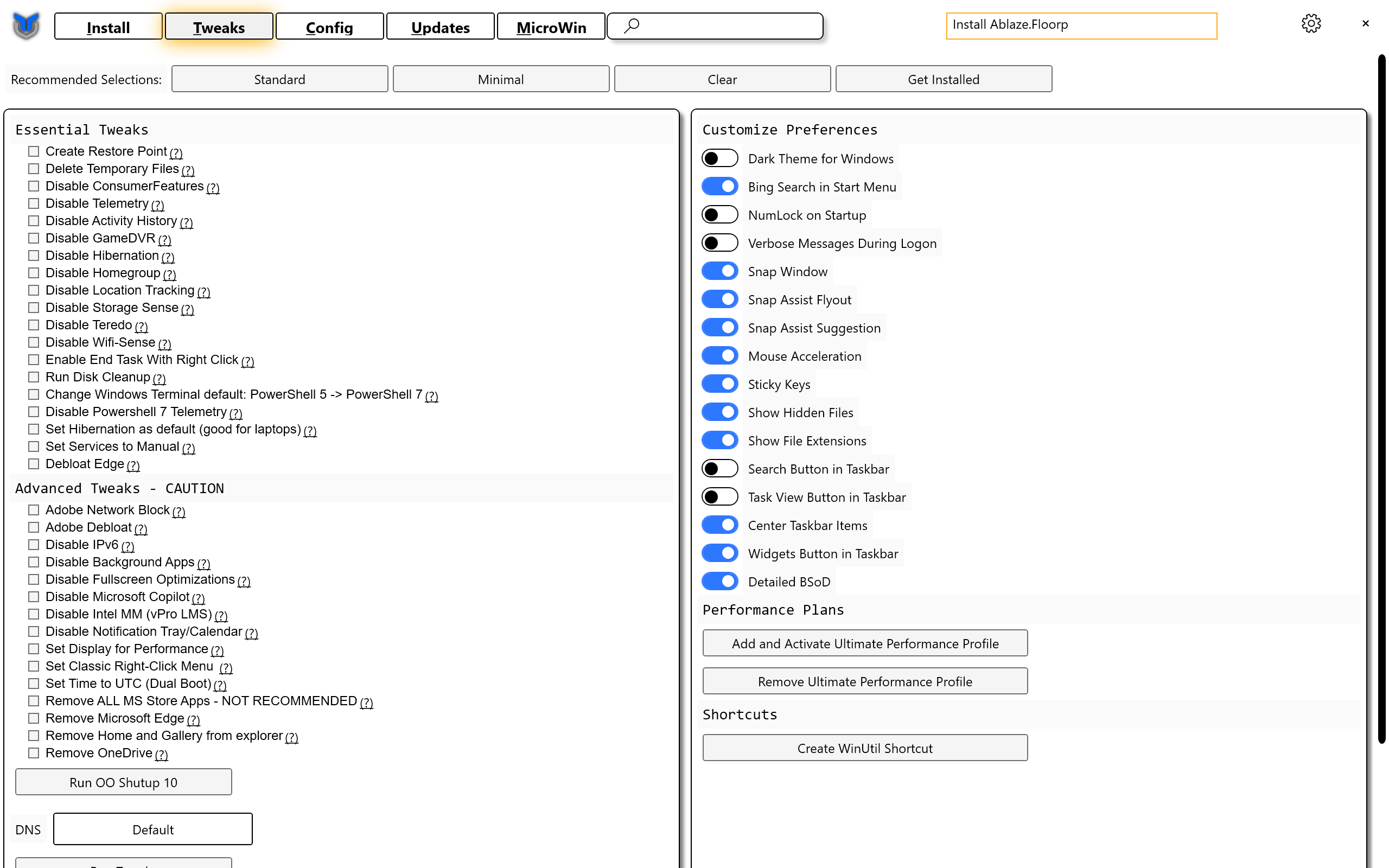 Tweaks é a segunda aba que o WinUtil possui. Inclui uma ampla seleção de opções de personalização. Eles são divididos em grupos de ajustes essenciais, ajustes avançados e preferências de personalização.
